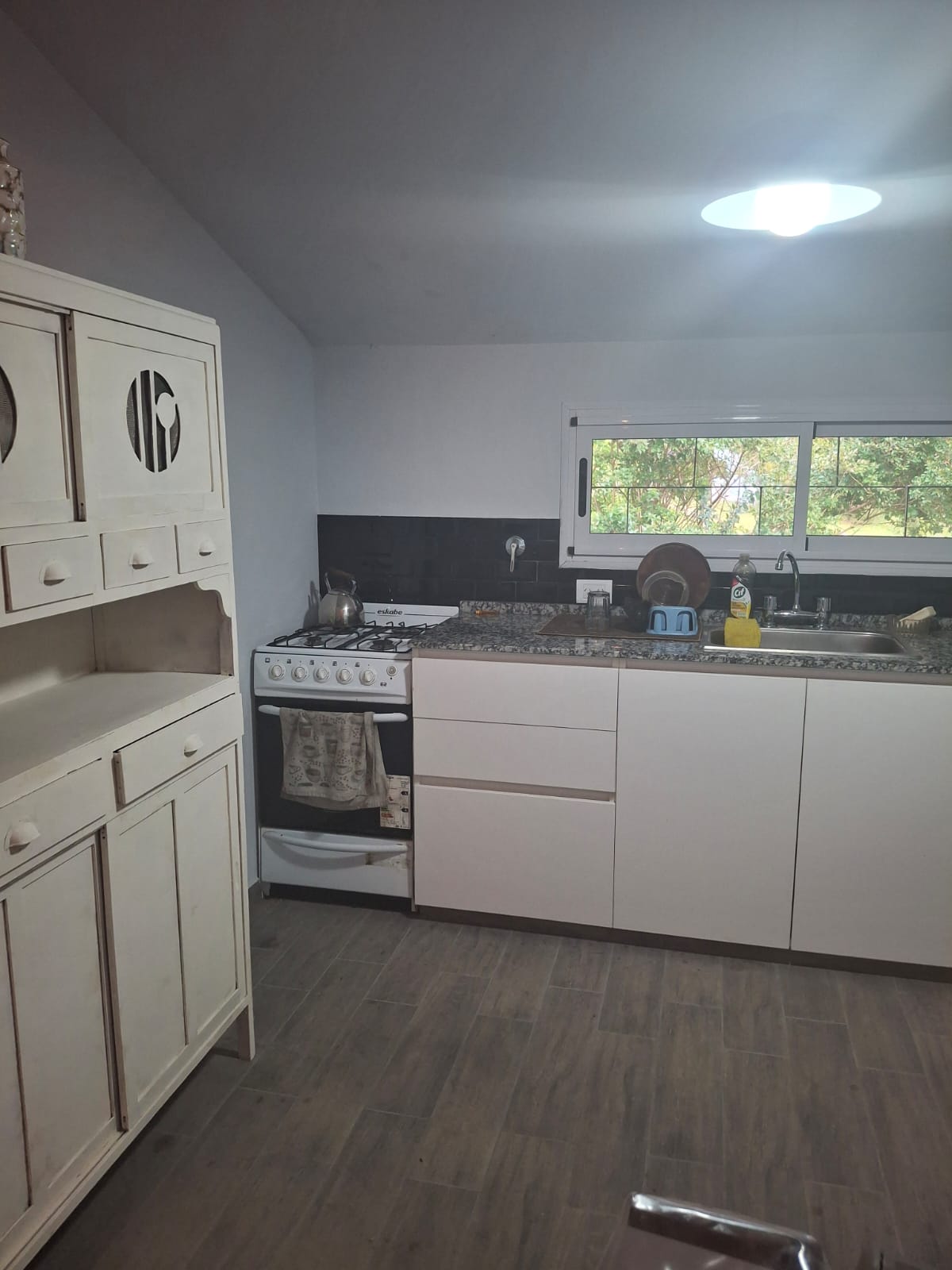 Chalet de 4 ambientes, con un dormitorio matrimonial, y dos dormitorios con dos camas de una plaza, baño y toalet, cocina equipada, living comedor, parque frontal y posterior, parrilla,