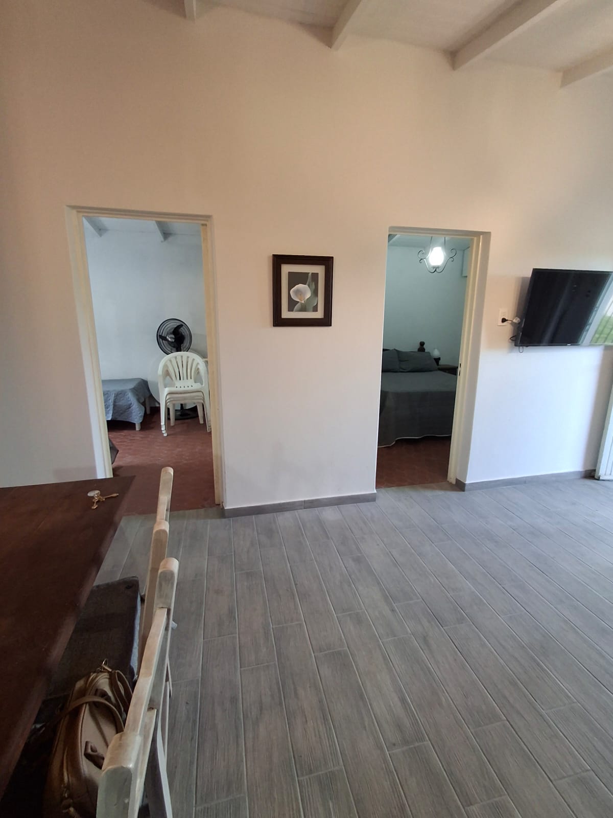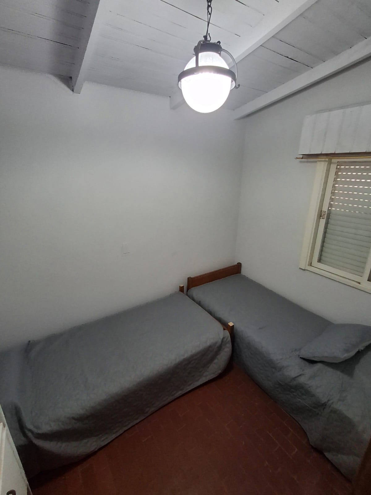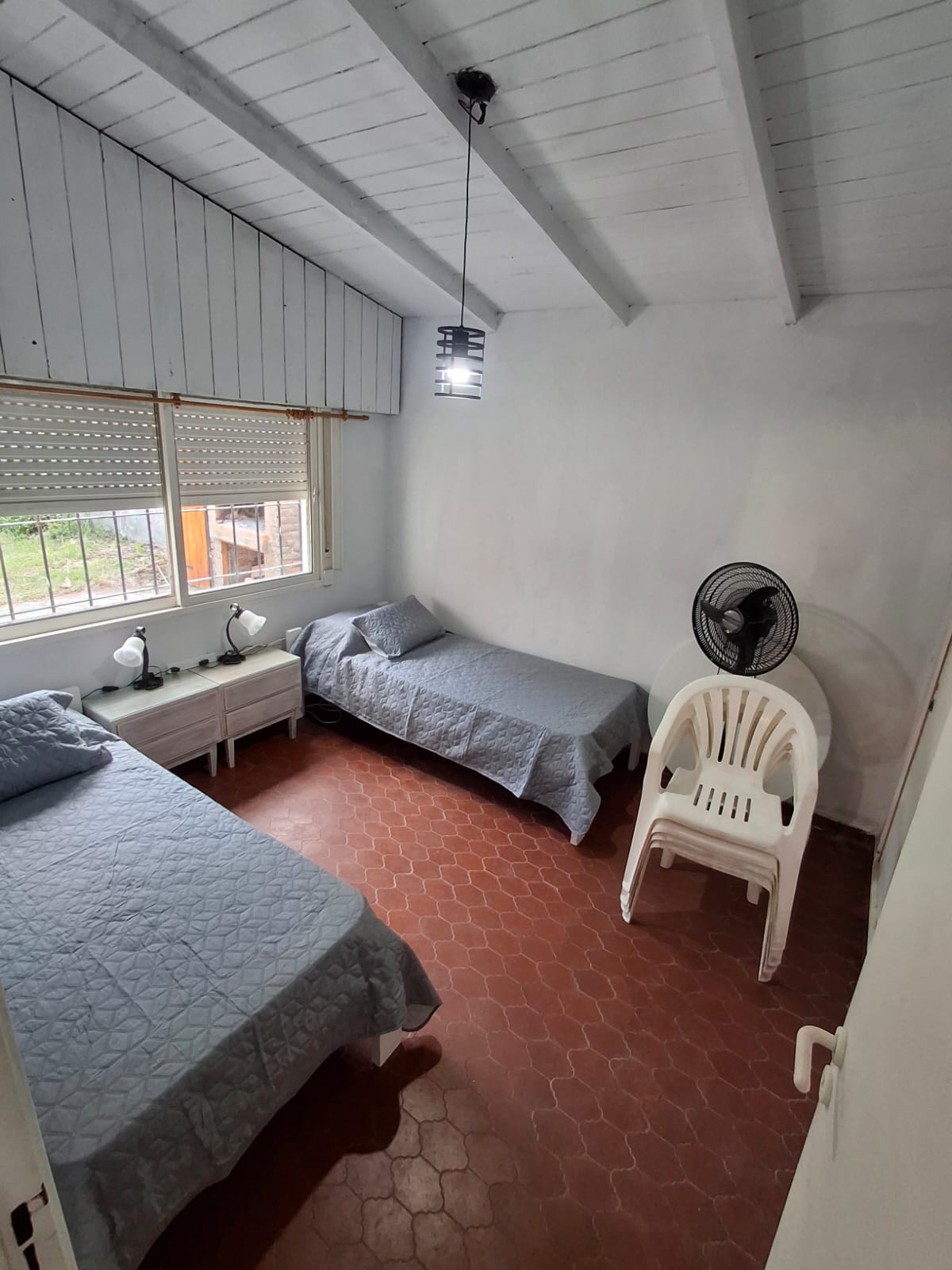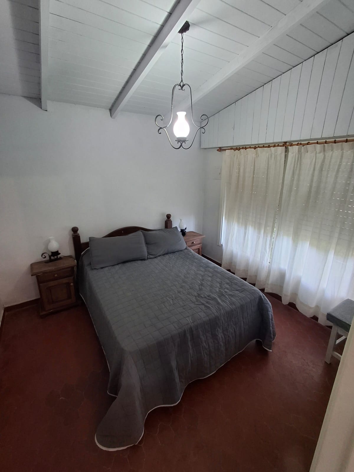 Chalet de 4 ambientes, con un dormitorio matrimonial, y dos dormitorios con dos camas de una plaza, baño y toalet, cocina equipada, living comedor, parque frontal y posterior,